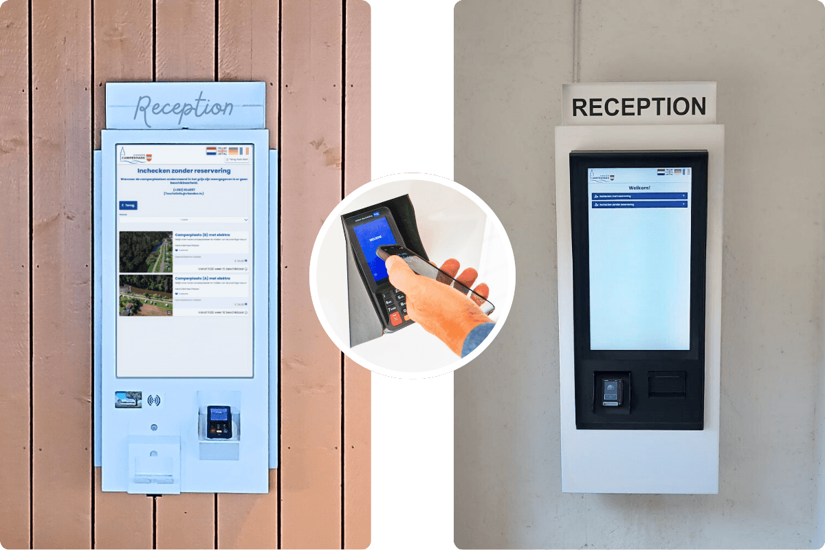 Een check-in kiosk is ideaal voor het verlichten van de druk op de receptie. Komt een gast buiten openingstijden aan? Dan kunnen ze eenvoudig inchecken bij de zuil. Ook voor het maken van een nieuwe reservering kun je bij de check-in zuil terecht. De opmaak is volledig in jouw huisstijl en beschikbaar in elke gewenste taal. Gasten kunnen hun nieuwe boeking direct betalen via pin of creditcard